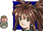 She has pink hair, tied back in a ponytail, and has long bangs. |